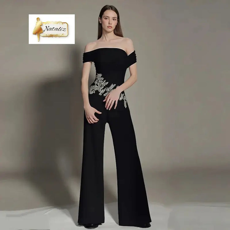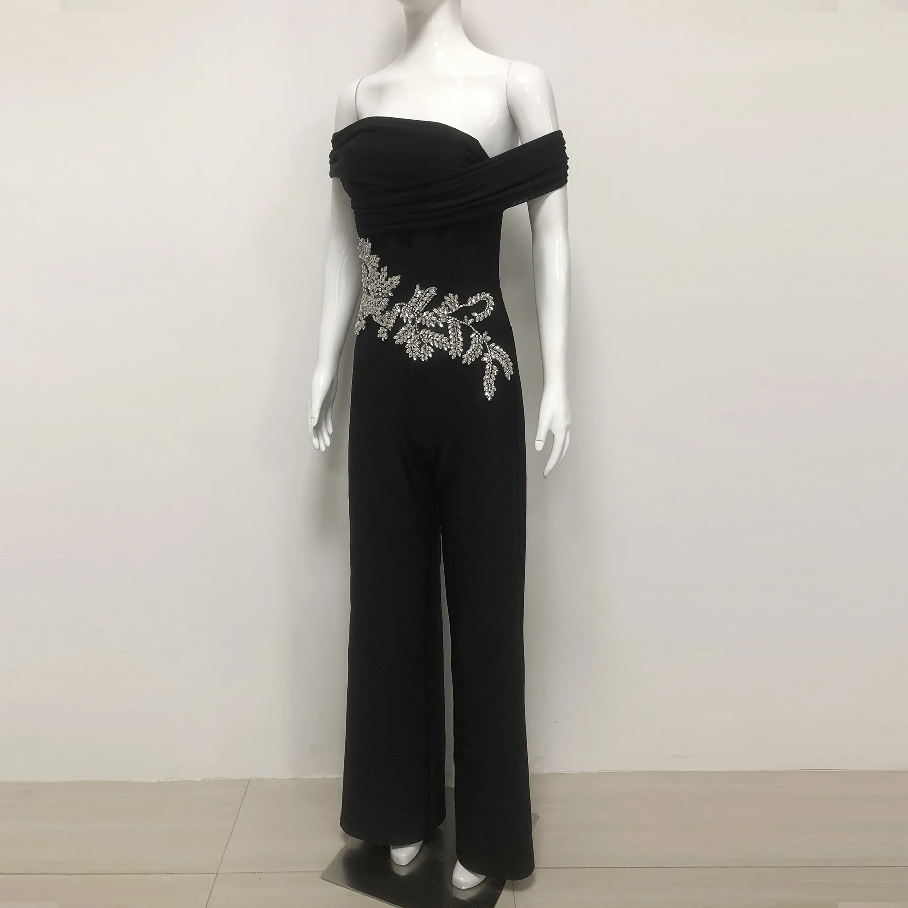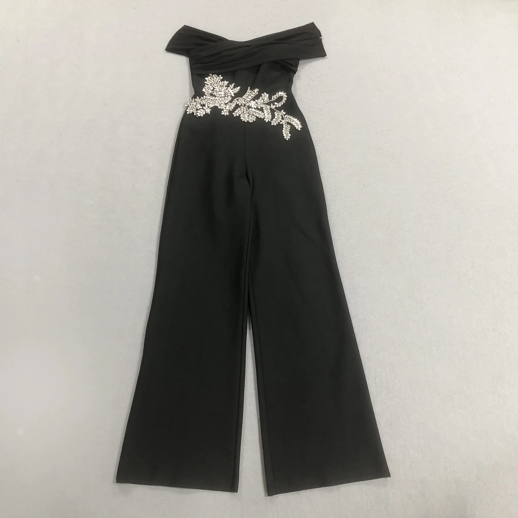 Black Off Shoulder Jumpsuit Rhinestone Bodycon Wide Leg